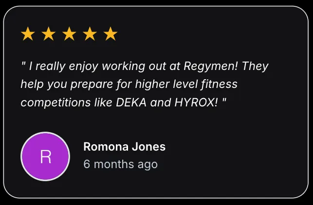 A generic plan doesn’t know your weaknesses. It can’t correct your sled push angle. It can’t adjust your pacing strategy based on benchmark data. And it can’t simulate race conditions with coaching feedback. REGYMEN provides certified coaching, individualized programming adjustments, real-time technique correction, performance assessment, and race simulation, all within an Official HYROX Training Club facility with competition-grade equipment.